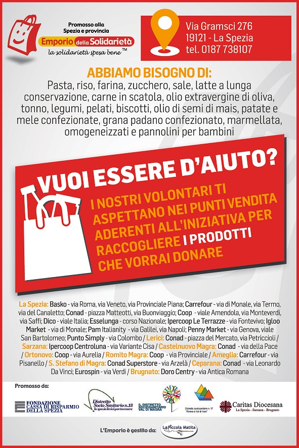 L’Emporio della Solidarietà, inaugurato nell’ottobre 2013, è il primo supermercato della provincia nato per aiutare chi ha bisogno. Avviato grazie alla collaborazione tra Caritas Diocesana La Spezia-Sarzana-Brugnato, Fondazione Carispezia e i tre Distretti sociosanitari provinciali, e gestito dalla cooperativa La Piccola Matita Onlus, l’Emporio è una risposta concreta alle esigenze del territorio che in questi anni di crisi ha visto aumentare i numeri di famiglie e persone che si trovano in temporanea difficoltà economica. Ad oggi sono state attivate complessivamente più di 800 card e aiutati circa 2.500 beneficiari.
