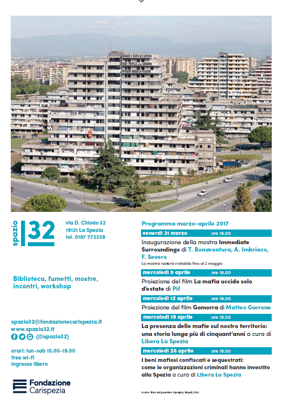 Durante il periodo della mostra Spazio 32 presenterà una serie di appuntamenti dedicati al tema dell’infiltrazione mafiosa con due incontri, mercoledì 19 e 26 aprile, a cura di Libera La Spezia (coordinamento provinciale di associazioni), oltre alla proiezione dei film “La mafia uccide solo d’estate” di Pif (mercoledì 5 aprile, ore 18) e “Gomorra di Matteo Garrone (mercoledì 12 aprile, ore 18).