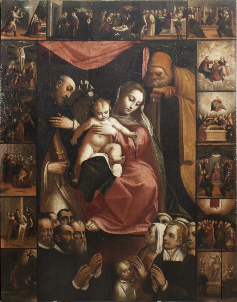 Madonna con Bambino, San Domenico, San Giuseppe e devoti; sui tre lati i 15 Misteri del Rosario