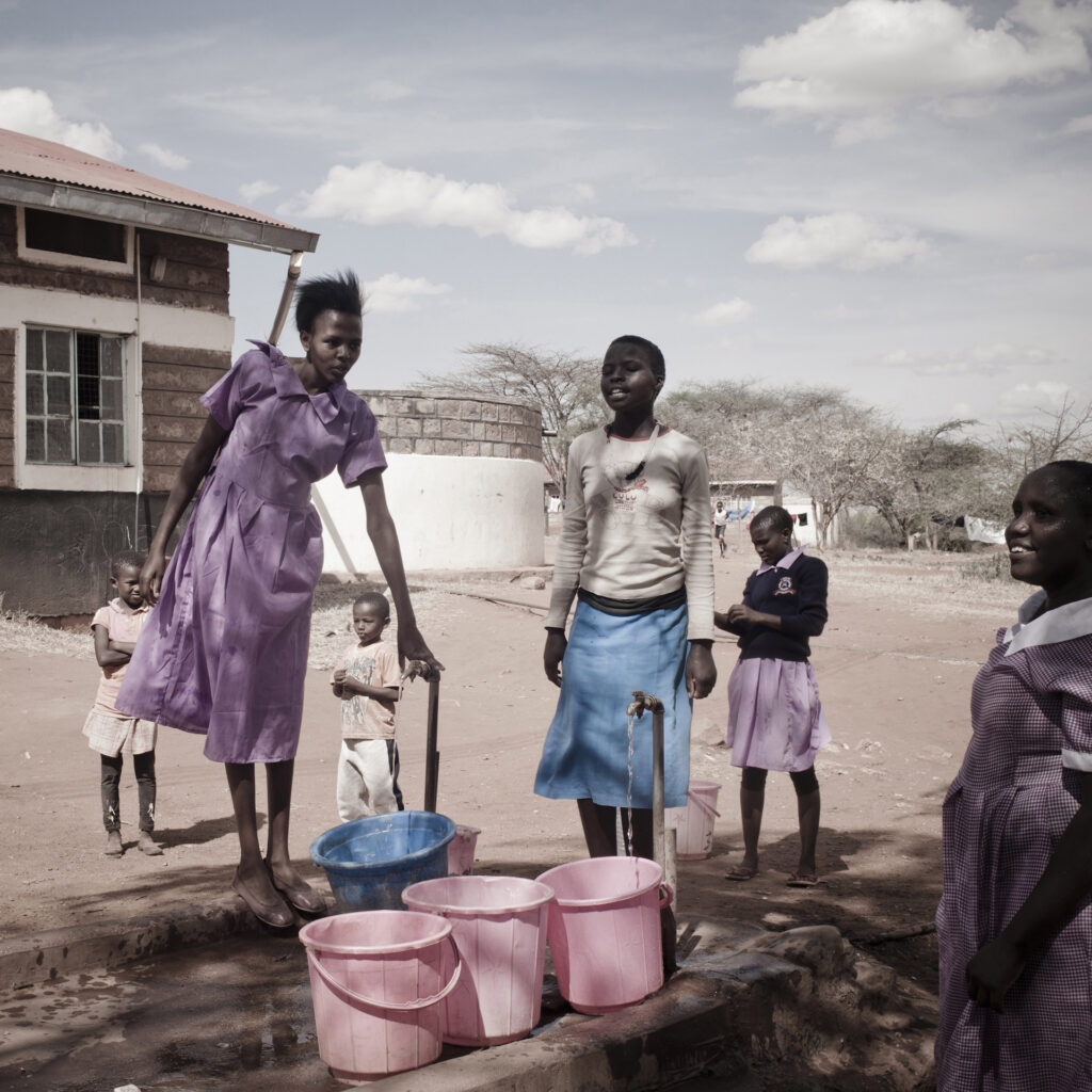 Ragazze prendono acqua dal pozzo al centro di recupero di Il Bissil, vicino la cittadina di Kajiado. Il Bissil, Kenya, 2015.
