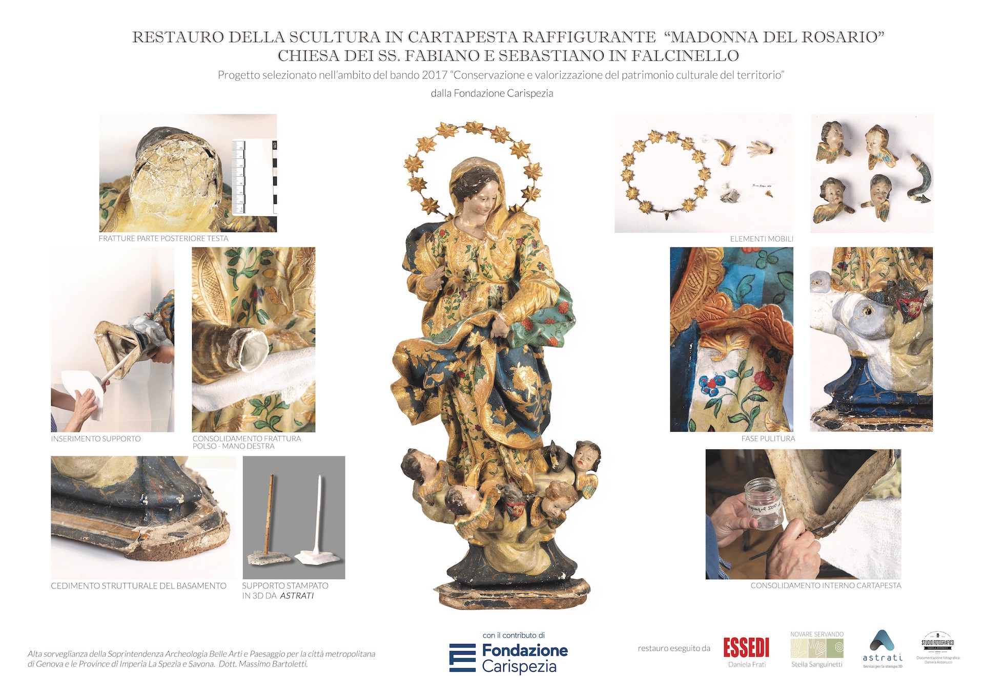 Si tratta di una pregevole scultura settecentesca in cartapesta policroma e dorata, il cui restauro è stato volto a ripristinarne la stabilità e recuperare la superficie, e per permettere di approfondire lo studio dell’opera che costituisce un importante esemplare della tecnica scultorea in cartapesta del ‘700, di cui sono conservati rari esemplari a causa della fragilità intrinseca del materiale.Il restauro è stato realizzato con la supervisione dell’Alta Sorveglianza della Soprintendenza Archeologia Belle Arti e Paesaggio per la città metropolitana di Genova e le Province di Imperia la Spezia e Savona.