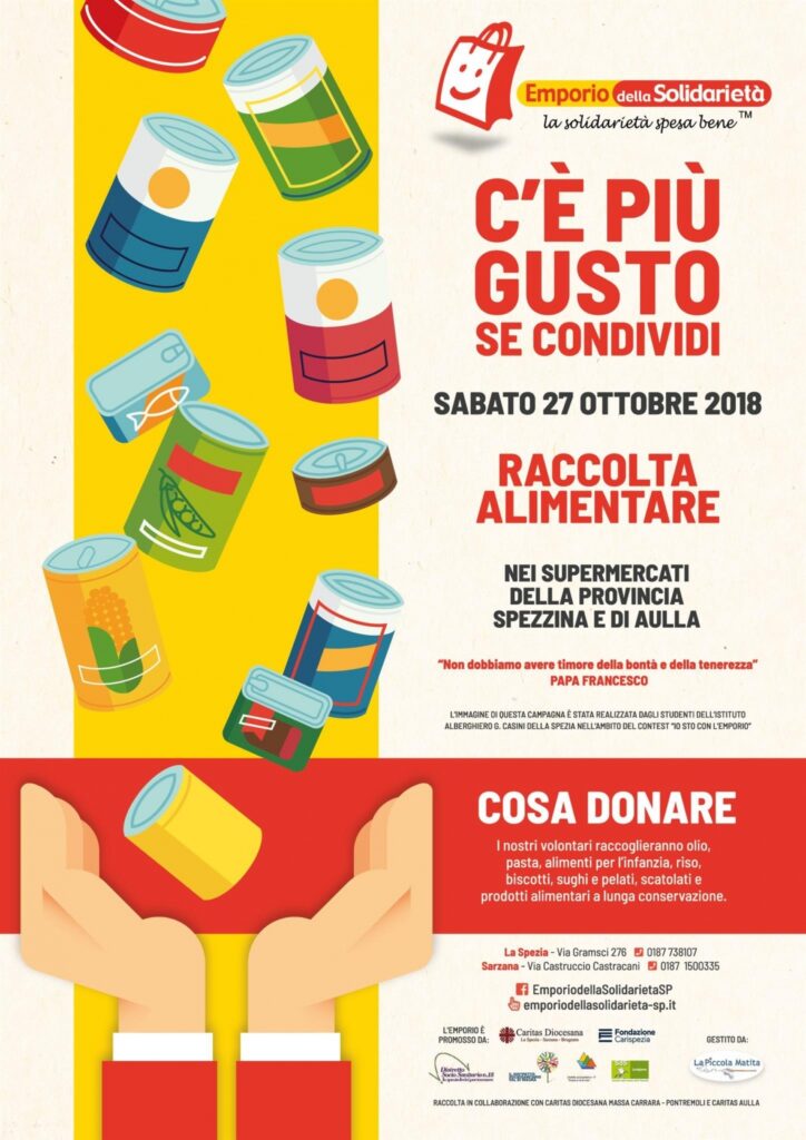 Sabato 27 ottobre, in oltre 40 supermercati in tutta la provincia della Spezia e per la prima volta anche ad Aulla, ritorna la raccolta alimentare a favore dell’Emporio della Solidarietà, il supermercato che consente l’accesso gratuito a generi alimentari e altri beni di prima necessità per persone e famiglie in temporanea difficoltà economica residenti nella provincia della Spezia e, da quest’anno, anche in Lunigiana.