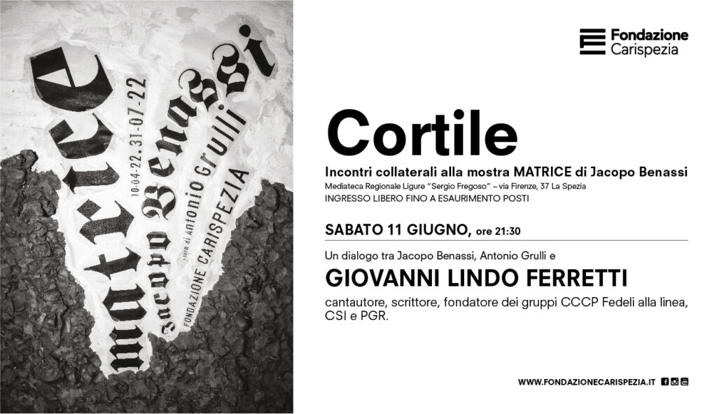 CORTILE, la serie di eventi collaterali alla mostra MATRICE di Jacopo Benassi, prosegue sabato 11 giugno (ore 21.30) alla Mediateca Regionale Ligure “Sergio Fregoso” con Giovanni Lindo Ferretti, cantautore, scrittore e fondatore di storici gruppi italiani quali CCCP Fedeli alla linea, CSI e PGR.