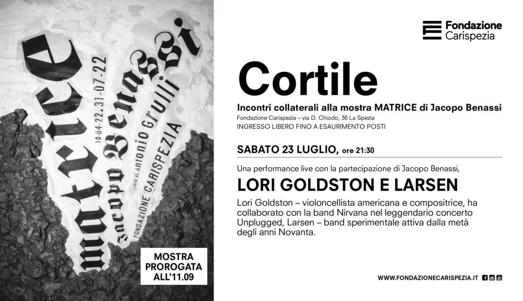 Si terrà sabato 23 luglio l’appuntamento finale di CORTILE, la serie di eventi collaterali alla mostra MATRICE di Jacopo Benassi, con protagonisti Lori Goldston, violoncellista americana e compositrice, e la band Larsen.