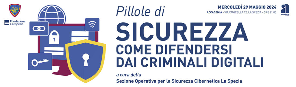 L’appuntamento, a cura dell’Ispettore Alessandro De Nanni, responsabile della Sezione Operativa per la Sicurezza Cibernetica della Polizia di Stato della Spezia, si svolgerà mercoledì 29 maggio alle ore 21.00 in Accademia, lo spazio studio della Fondazione in centro città alla Spezia (via Vanicella, 12).